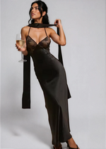 A symphony of lace and skin. A deep V-neckline framed by delicate embroidery, a plunging open back that commands the room, and a floor-sweeping silhouette that flows with every movement. Midnight black, ethereal, and dangerously elegant.